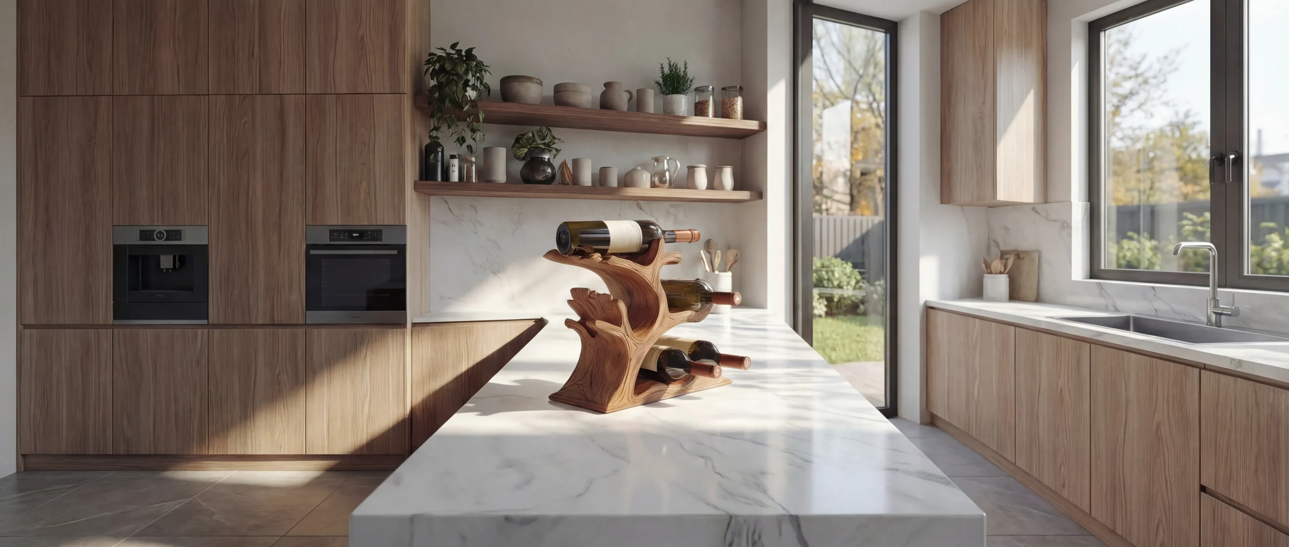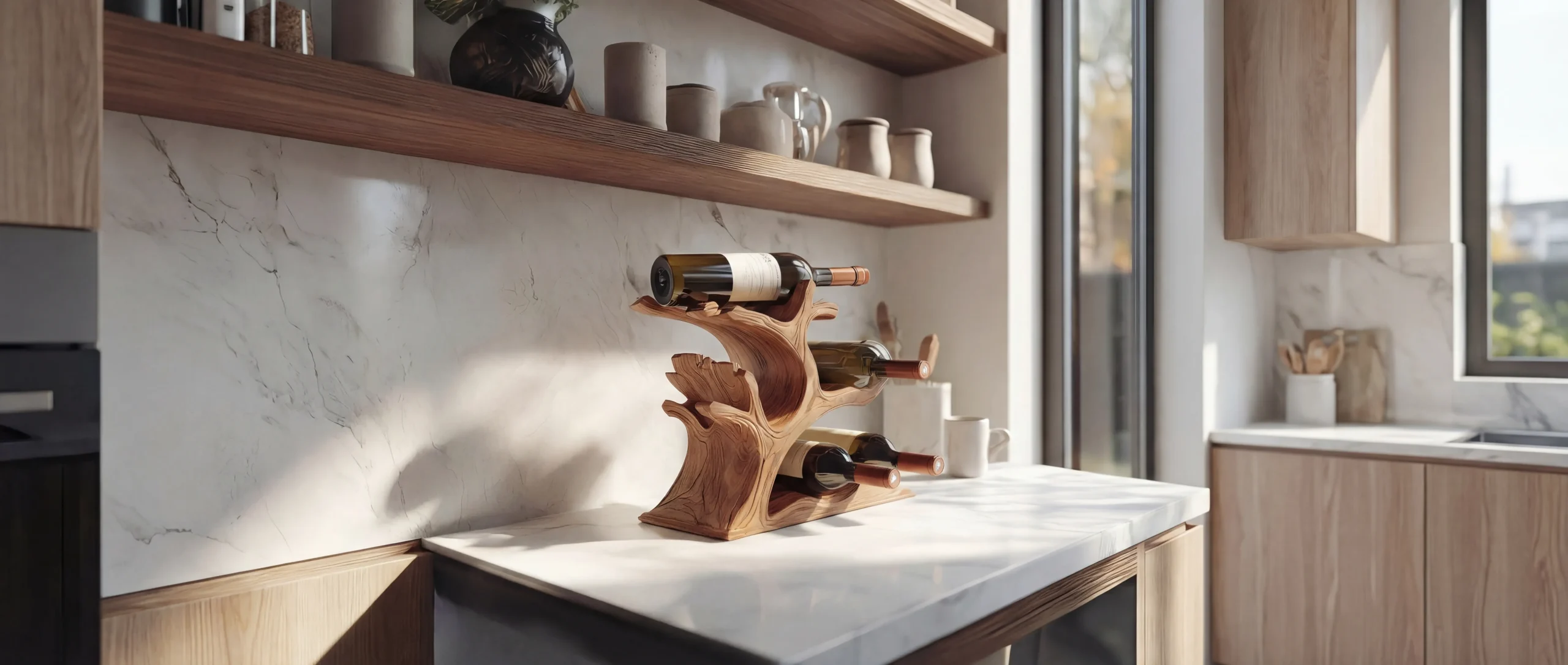 A sculptural solid wood wine rack with branching organic lines. This countertop piece cradles bottles as if they were artwork, adding warmth, texture, and contemporary character to modern kitchens, dining rooms, and curated home bars.