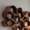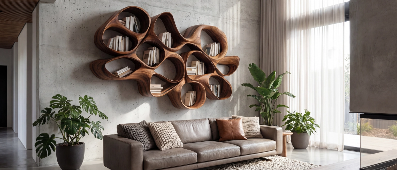 Wall-mounted sculptural bookshelf with interconnected compartments for display and organized storage.