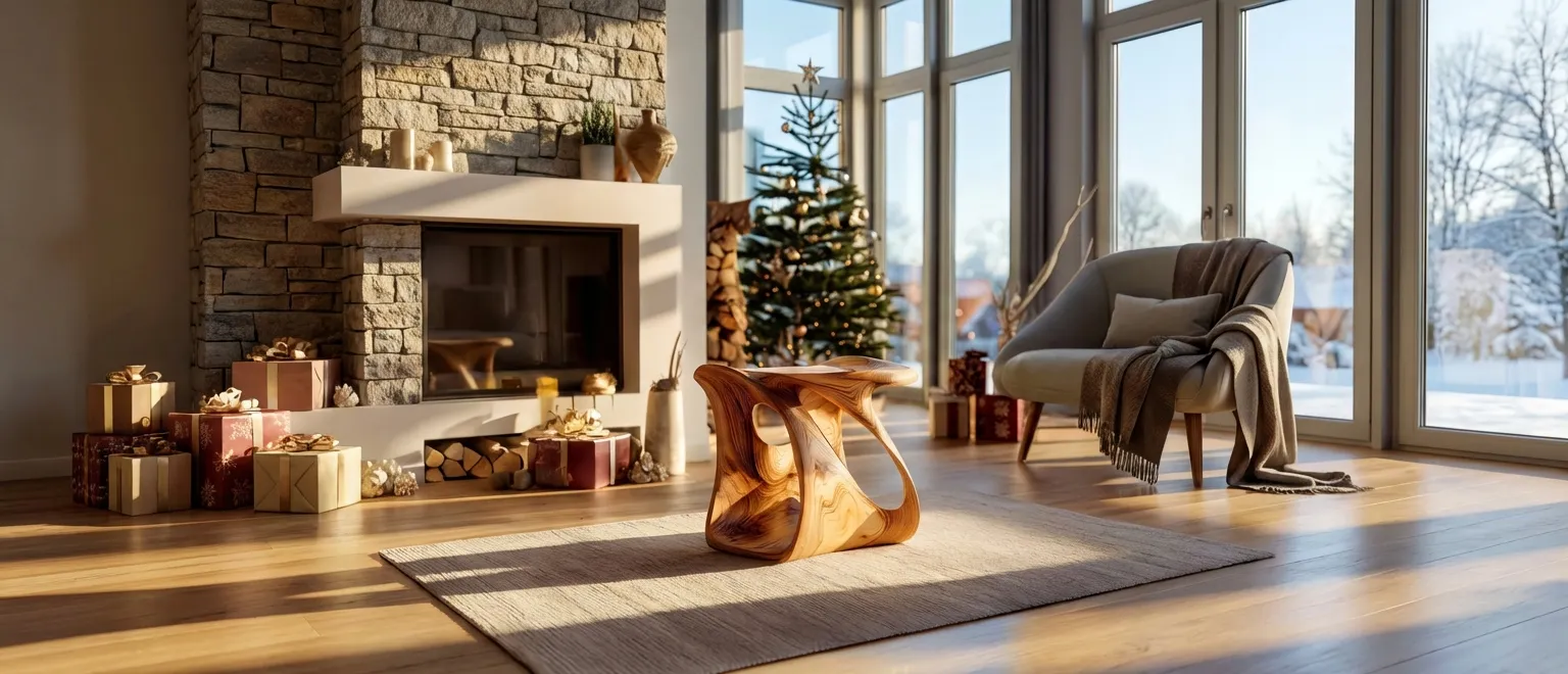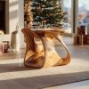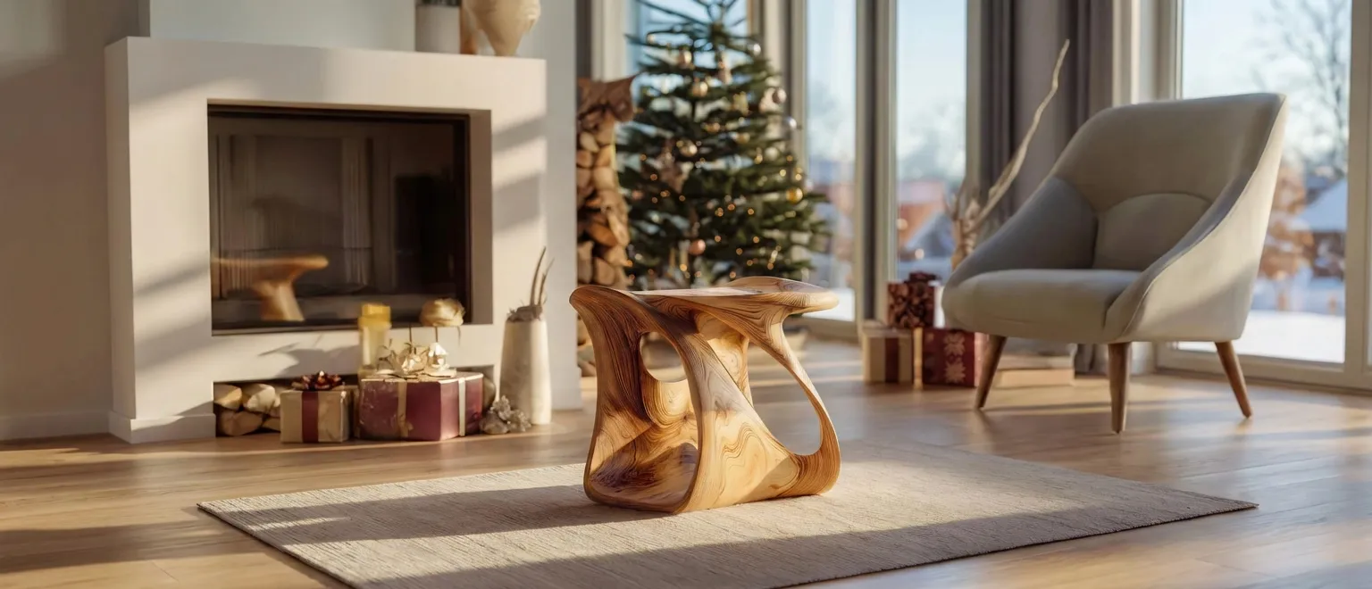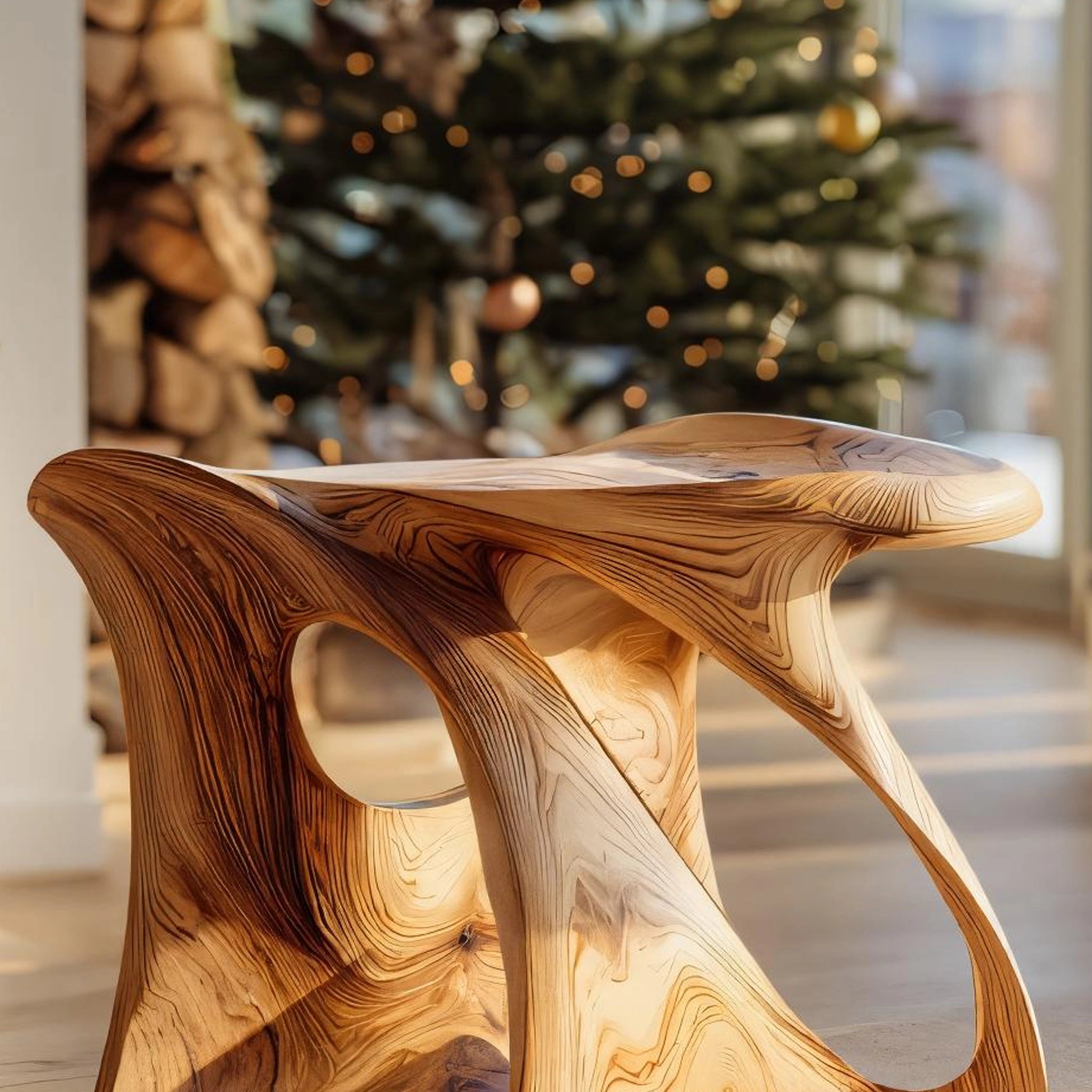 This sculptural accent stool combines form and function with its fluid, ribbon-like silhouette. The piece features open cut-outs and rounded edges, creating dynamic light play while offering a comfortable perch or display surface. Ideal for modern interiors, it adds warmth and visual softness to any space.