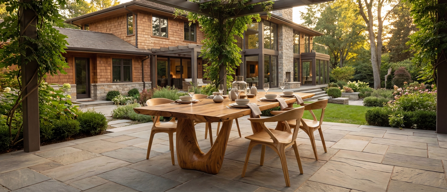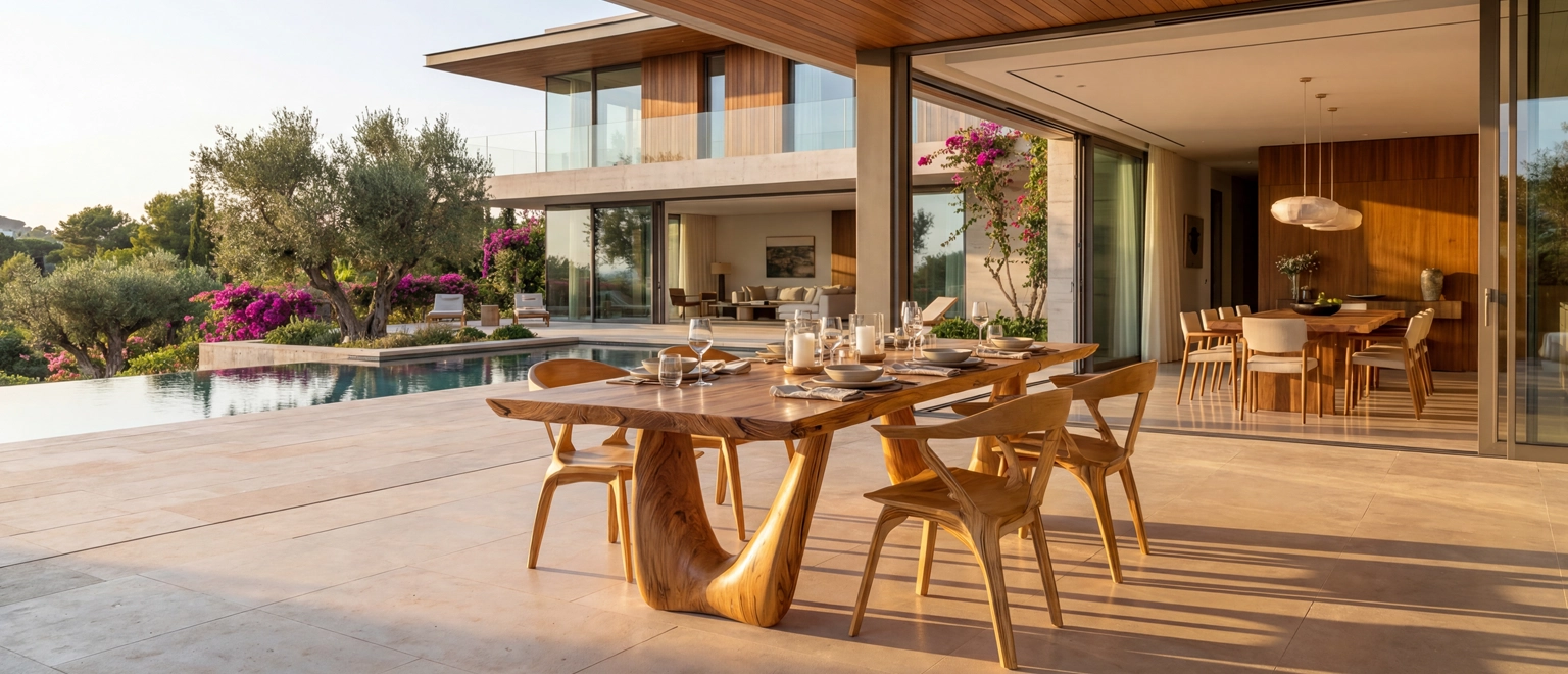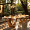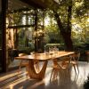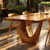 This sculptural dining table features a long, smoothly contoured tabletop paired with a distinctive curved base. The flowing form creates visual balance while providing a generous surface for everyday dining and gatherings. Visible grain patterns and natural tonal variation add depth and character, making each piece subtly unique.
