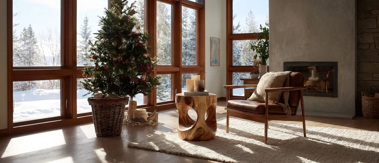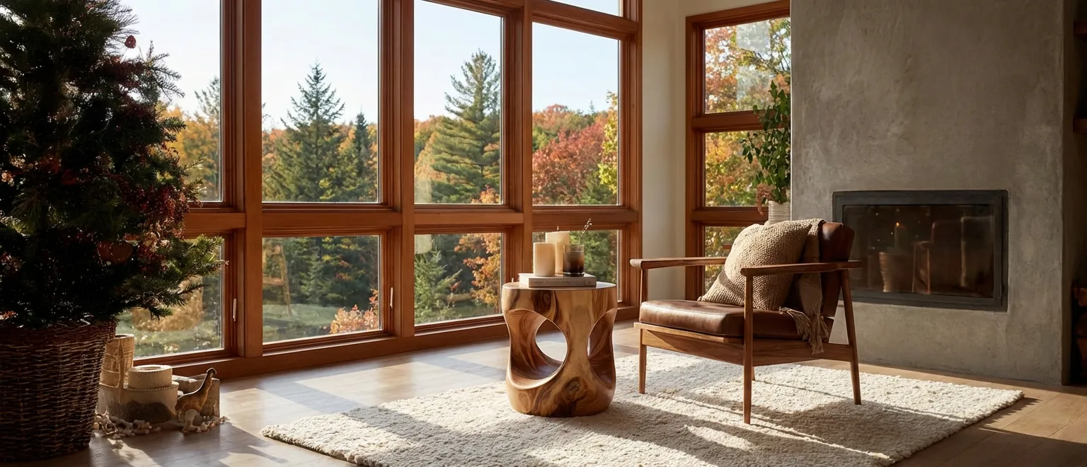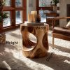 This sculptural solid wood drum side table, with smooth organic cut-outs, brings warmth, texture, and contemporary organic modern decor to living rooms, reading corners, and cozy winter interiors.