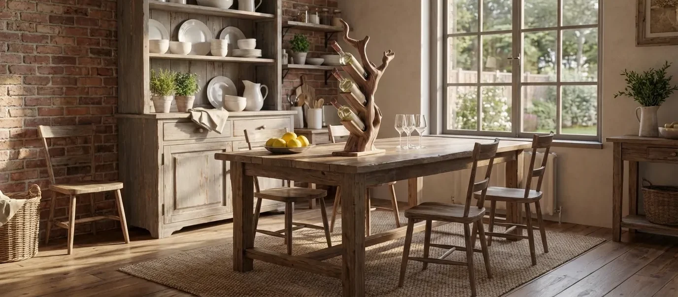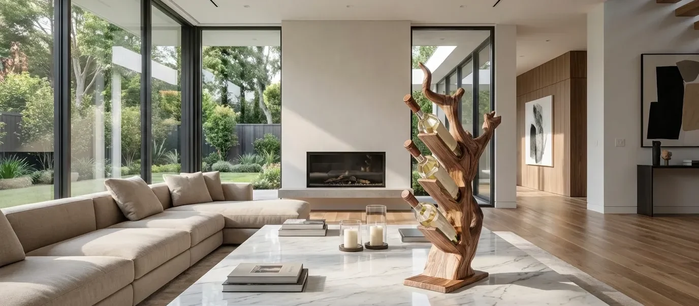 This sculptural wine rack combines practical bottle storage with an elegant design, inspired by tree-like forms. The upright silhouette and branching supports hold bottles at a gentle angle, creating a dynamic yet balanced display. The rack’s smooth wooden surface and expressive grain detail add warmth, making it a refined feature in contemporary kitchens or home bar areas.