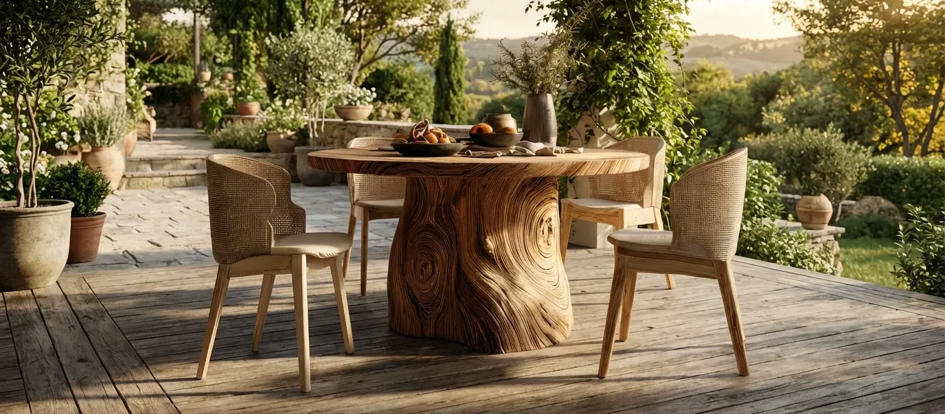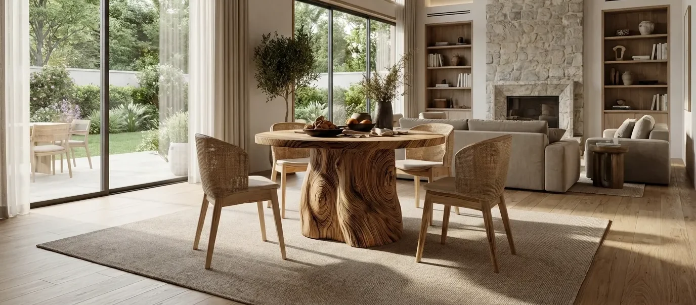 This dining table features a round tabletop supported by a single central pedestal, creating a balanced and space-efficient layout suitable for everyday dining. The thick top provides a stable surface for meals and gatherings, while the solid pedestal base offers reliable support and visual weight at the center of the table.
