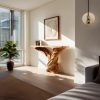 This sculptural console table features a floating linear top supported by a distinctive twin-twist solid wood base, creating a refined balance of movement and structure. It serves as both a functional surface and a gallery-inspired statement for modern entryways, hallways, and living spaces.