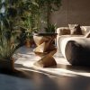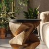 This sculptural side table features a dynamic helical base with angled planes, creating a dramatic twist. The contrast between the rich grain of the base and the dark circular top adds depth, making it a striking accent piece for modern interiors. It serves as both a functional surface and a refined design feature.