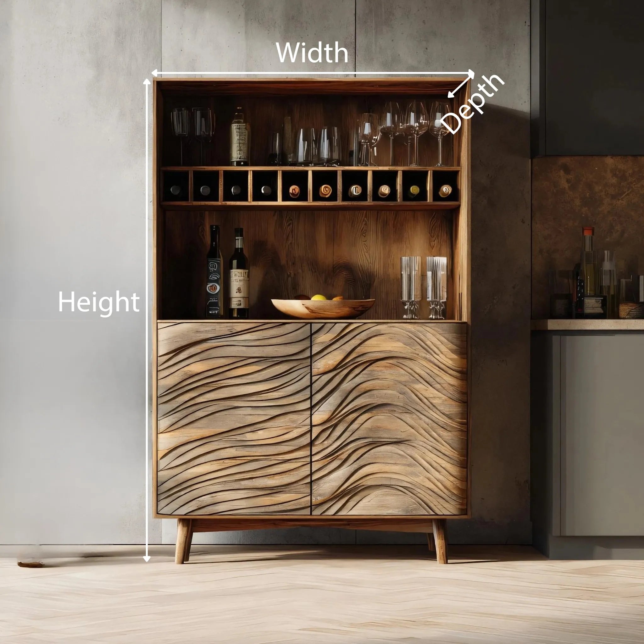 Bar cabinet with wave-pattern front, open shelving, and integrated wine storage for modern interiors.